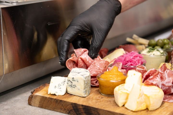 Anretningen suppleres af luksuriøst charcuteri fra øverste hylde, som kan inkludere italiensk trøffelsalami, østrigsk speck, spansk Gran Reserva serrano eller bresaola af oksefilet modnet i flere måneder.